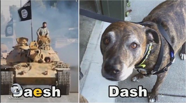 混種比特犬「阿飆」(Dash)是一頭擅長撫慰人們心靈的服務犬(Service Dog)。但是因為牠的英文名字Dash,跟遜尼派極端組織「伊斯蘭國」(IS)的英文別名Daesh(達伊沙)的拼法和發音太過相近,讓加州一家銀行的職員感到驚慌,一度以為發生恐攻。