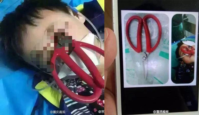 根據《重慶晨報》報導,這張男孩被剪刀刺入眼睛的照片在大陸的微信朋友圈瘋傳,引發家長的熱烈討論,事發地點在試穿的巴中,28日下午男孩不慎摔倒,銳利的紅色大剪刀不小心插進左眼,立刻被送醫急救,剪刀雖然已經取出,但男童尚未脫離險境,也提醒各位家長要將銳利物收好,以免孩童誤觸受傷。