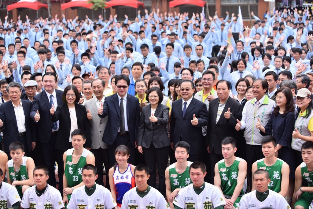 民進黨總統當選人蔡英文31日上午在立委邱志偉、管碧玲、高苑工商董事長余政憲等人陪同下,出席「高苑工商45週年校慶」,勉勵高苑棒球、籃球運動培育,「用盡全力逐夢,你們之中一定會有下一個陳偉殷」。