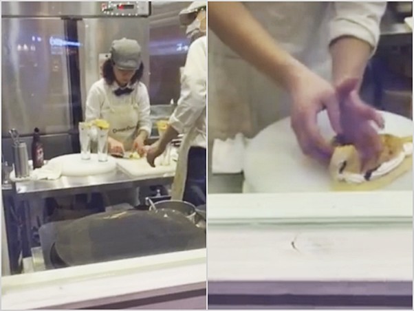 ▲1個130元這樣做…情侶爆Outlet店員摳耳「手刀」煎可麗餅。(圖/翻攝爆料公社)