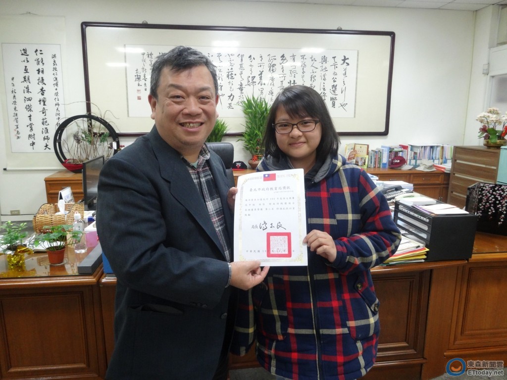 ▲陳沛縈(右)榮獲台北市語文競賽閩南語朗讀組第三名,校長洪仁進親自接見並表揚。(圖/教育部提供)