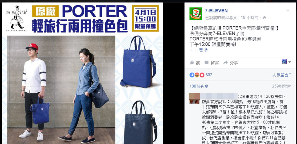 為了吸引消費者青睞,7-ELEVEN自上次推出PORTER包就造成轟動,而今日(4月1日)再接再厲,又推出PORTER輕旅行兩用撞色包和零錢包,且於下午三點限量開賣,但沒想到卻引發網友不滿,紛紛上官方粉絲團留言砲轟。