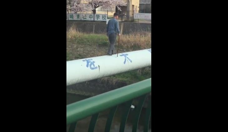 影片可見,橫跨河道的橋梁外,一名老爺爺腳步穩健,踩在水管上頭飛快行走,雖然有攜帶拐杖,但卻完全沒有使用,也不見他有絲毫猶豫卻步,盡頭時,一個翻身攀過柵欄,平安抵達對岸,過程全被橋上一名網友拍下後PO上網路。網友看完嘖嘖稱奇,佩服地說「達人級的平衡感」、「傳說中的武林高手?」