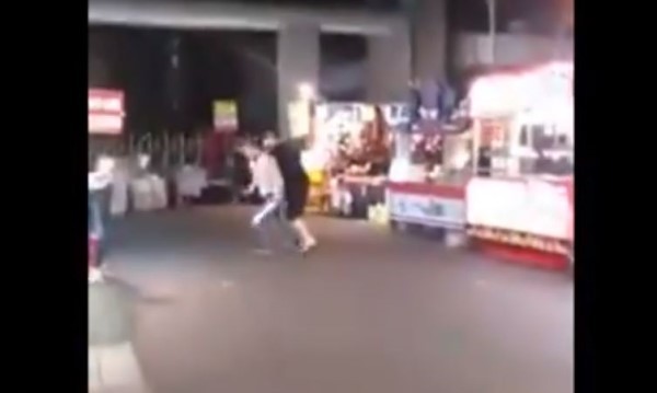▲王男(白衣)因攤位擺設問題,持西瓜刀砍傷隔壁攤的周男。(圖/翻攝自爆料公社)