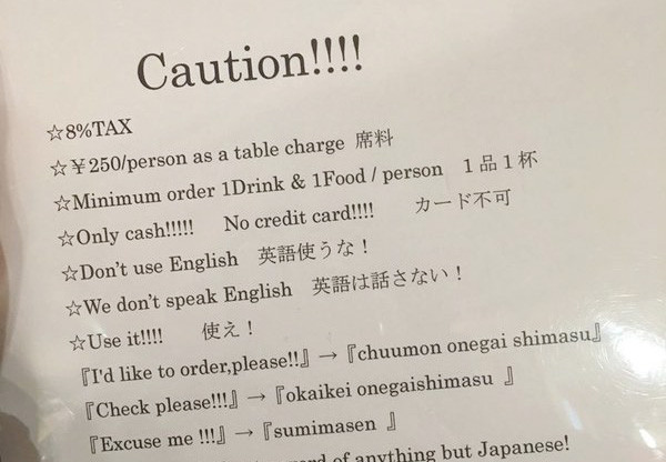 日本是許多旅客心中嚮往的旅遊好去處,語言溝通也往往是出門在外最讓人害怕的一點,不過東京一家餐廳貼出公道禁止客人說英文,也禁止他們說除日語以外的語言,日本模特兒保田Jun(保田ジュン)將這張規矩放上網,表示有外國遊客因此憤而離開餐廳,此舉也引發不少討論。