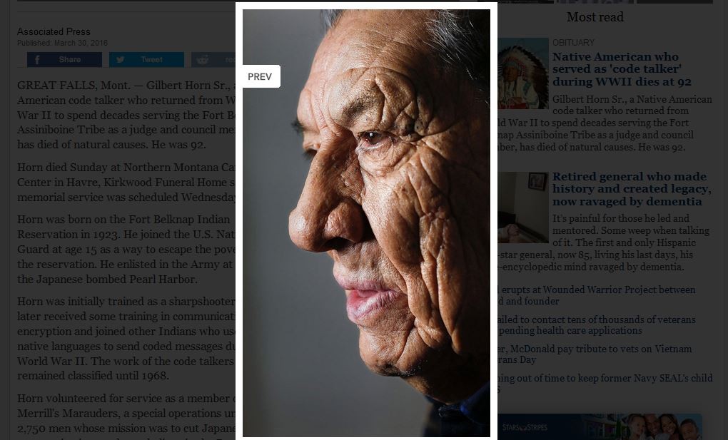 二戰期間曾擔任美軍「風語者」的印第安土著吉伯特•霍恩,戰後的幾十年一直在貝爾納普堡(Fort Belknap)的阿西尼博因部落(Tribe Assiniboine)擔任法官和議員,他在3月27日離世,享年92歲。
