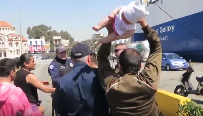 近來歐洲各國紛紛祭出遣返非法難民的政策,一名不滿的難民6日在雅典比雷埃夫斯港(Port of Piraeus)與警方衝突時,高舉嬰兒作勢威脅要摔在地上。所幸警方發現後,及時把他壓制在車門上,才免於悲劇發生。