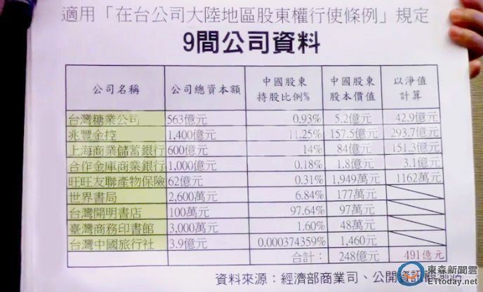 根據陳瑩提供的資料,適用該條例的公司包含台糖、兆豐金控、上海商業銀行、合作金庫、旺旺友聯產物保險、世界書局、台灣開明書局、台灣商務印書館、台灣中國旅行社等9家,而依各家市值的中國股東持股比例來看,給大陸股東的股本價值為248億元。