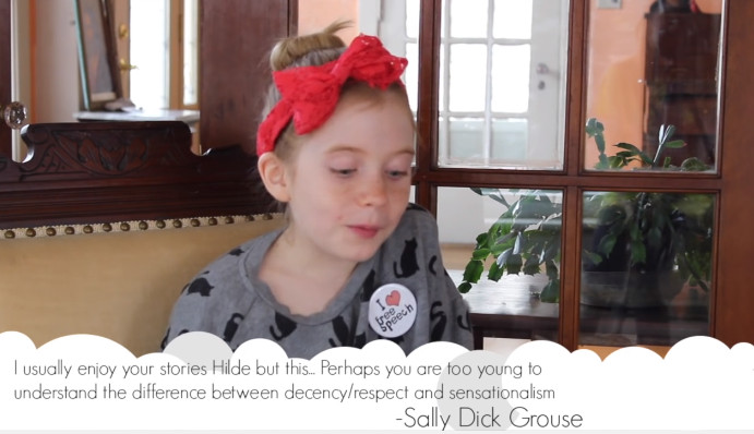 這次的命案是有男子用鐵鎚敲死妻子,她還寫成獨家新聞〈獨家:9號街發生兇殺案!〉(Exclusive: murder on Ninth Street!)但卻引來網友惡評,「這個可愛女孩還真以為她是真正的記者?我感到非常噁心」、「9歲大的小女孩,該做的事是去玩洋娃娃,而不是去當記者」