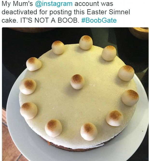 一張用來慶祝復活節的水果蛋糕(simnel cake)照片,本來無啥好禁忌的。但日前竟然被著名照片分享網站Instagram封殺,上傳照片的女事主戶帳戶被強行關閉。這宗誤會皆導因於那個蛋糕, 因為據說它的外形太像女性的「咪咪」!