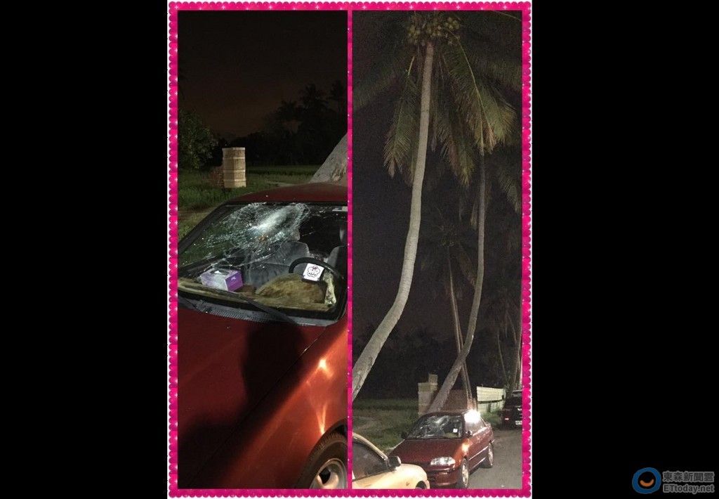 蔡姓網友向《ETtoday新聞雲》記者表示,他7日晚間行經高雄大寮後庄火車站附近,看到有輛紅色轎車停在椰子樹下方,前方的擋風玻璃被「天上掉下來的椰子」砸碎,讓他忍不住笑道:「天有不測風雲,人有旦夕禍福,車有天空椰子阿!」