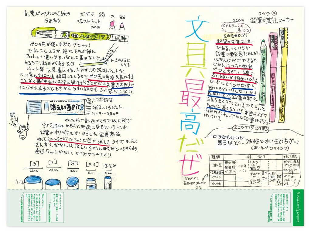 只要看過山本健太親自撰寫的文具圖鑑,就能明白他是個不折不扣的文具控,對於鉛筆、原子筆、立可帶或橡皮擦等任一個文具的使用評語,不是只有好用或不好用,而是仔細說明不同筆款的著色效果、哪支筆不適合速寫,甚至還比較不同文具牌子,介紹品牌歷史和主要產品等,同時附上清楚描繪文具外觀與細節的手繪圖,在豐富的圖文中,讓人見識到他對文具的熱愛程度。