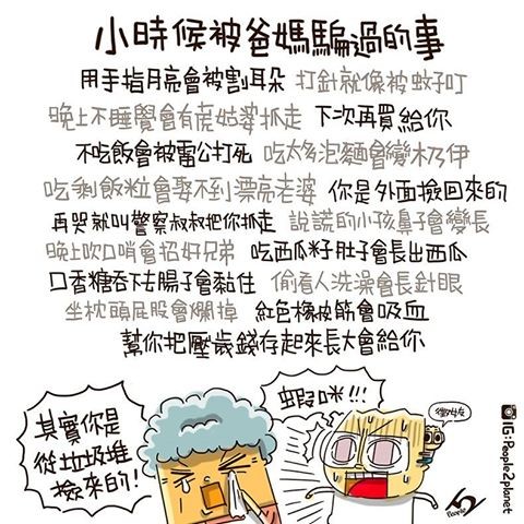 對此,插畫作家人2 x People2在臉書po出一張「小時候被爸媽騙過的事」繪圖,圖片一出,吸引許多網友在下方留言直說「真的是太中肯了!」