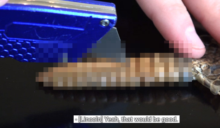 接下來他們開始把尾巴劃開,可以看到尾巴內部的構造呈現中空,Dan說響尾蛇尾巴是由名叫「響環」的堅硬角質層構造構成,有如中空的串珠,搖動尾巴時就會因為摩擦跟空氣振動而發出響亮的聲響。另外,Dan還說明,響尾蛇的尾巴振動頻率高達每秒50次