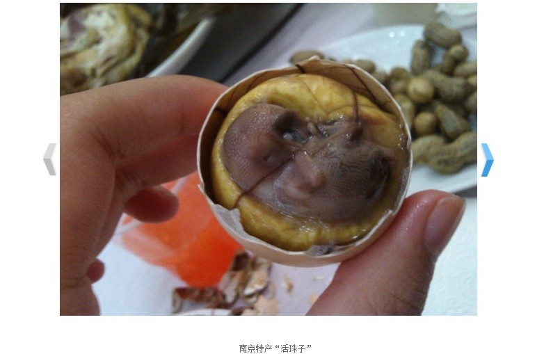 南京特產「活珠子」類似鴨仔蛋,是受精的雞蛋在尚未孵化前的「雞胚胎」,煮熟後味道鮮美,是六合地區的特產,當地更盛傳「童叟弱者要是能常吃,還有健脾、胃等功效。」