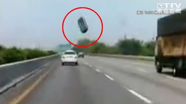 現在很多車子都會加裝行李箱,可以增加收納的空間,不過要是沒裝好,可是會造成致命危機,一個驚險畫面,汽車行駛在國道上,前方竟然飛出一個黑色物體。黑色物體從前方行駛中的白色車脫落往後飛,直接砸到右邊正在行駛的貨車,在空中翻了好幾圈,再衝向中央分隔島,好在後方車輛急忙避開,沒有發生嚴重事故。