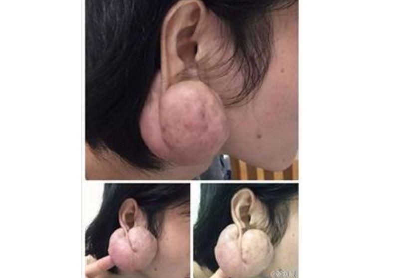 ▲因為體質容易留下疤痕,26歲男子的耳朵長出手掌大小的「肉芒果」。(圖/翻攝自大陸網站)