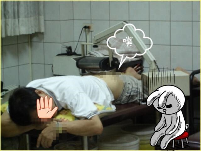 「那....那請你先躺好,趴在診療床上,我.....我幫你照個紅外線燈.......」我開始操作機器。