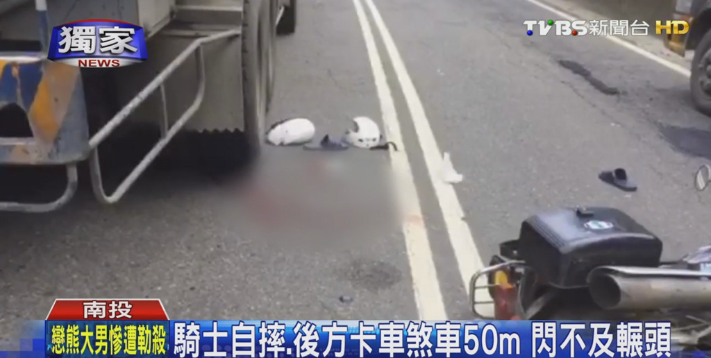 ▲卡車輾過削頭皮!騎士驚險逃爆頭死劫。(圖/翻攝TVBS新聞)
