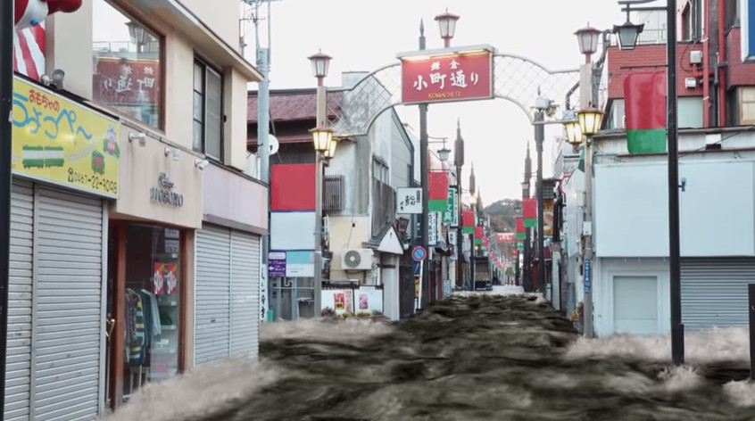影片一開始先重溫311大地震時的恐怖海嘯景象,並介紹海嘯的形成原因、與長浪的不同之處,後來便以鎌倉4個地點為例,一一用電腦動畫呈現海嘯侵襲的場面,海水很快就衝破防波堤,並淹沒市內神社、大街小巷及民宅等地,畫面相當具有震撼力。