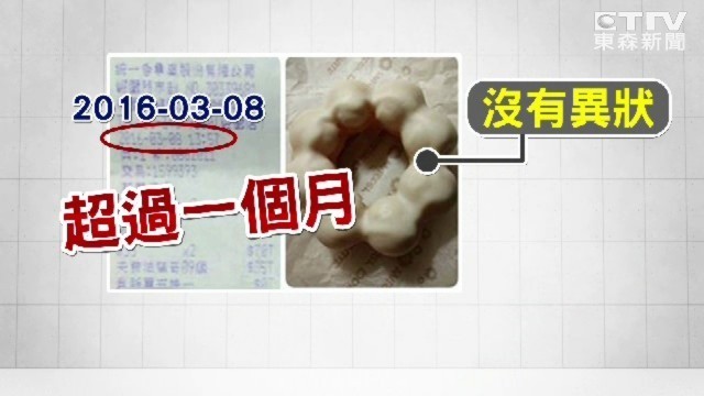粉紅草莓、黑色巧克力或是綠色抹茶,甜甜圈口味五花八門,但是這一顆優格甜甜圈特別被拍下來,光用看的外觀沒什麼異狀;但接下來,旁邊一張發票上日期是2016-03-08,也就是1個月前,民眾誤把甜甜圈放了1個多月,驚訝發現沒發霉、沒變色,還切開來看看裡面,甚至做了「危險動作」吃了一顆說也沒有怪味,因此對裏頭的成分打了個大問號,民眾指出,「感覺沒那麼新鮮,可能防腐劑什麼加比較多,所以不易腐壞。」