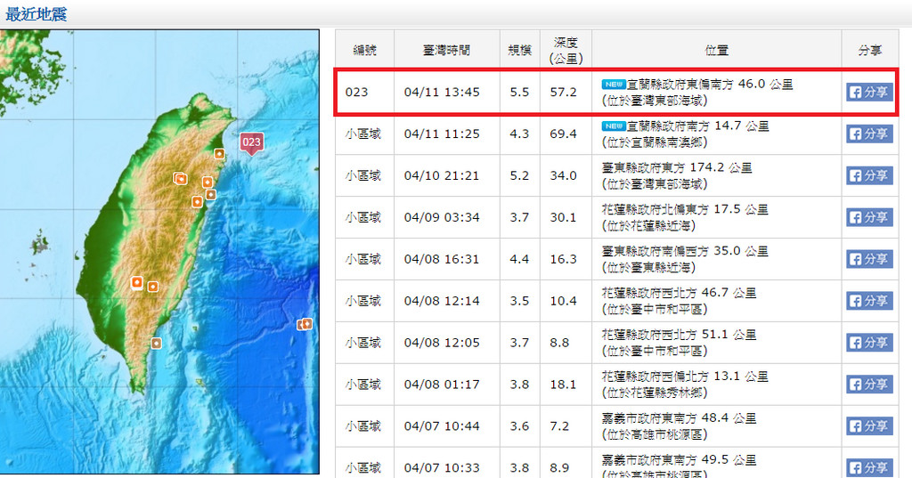今天(11日)13時45分左右發生有感地震,各地出現明顯搖晃,震央在宜蘭縣政府東偏南方46.0公里外海處,最大震度為宜蘭、花蓮4級,南投3級。另外,稍早11時25分,在宜蘭縣南澳鄉也有發生規模4.3地震。