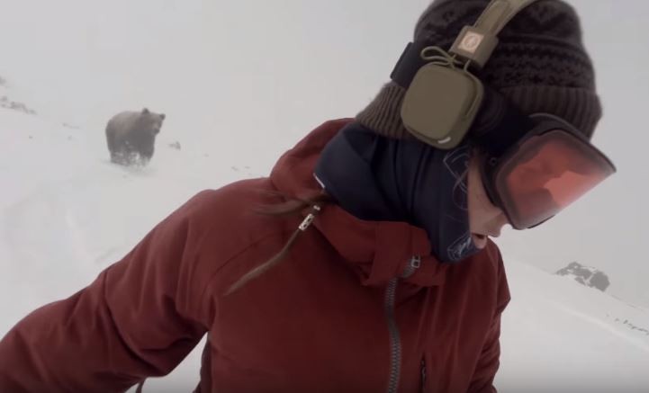 ▲她戴耳機自拍滑雪,竟沒發現巨熊沿路追殺。(圖/翻攝自YouTube)