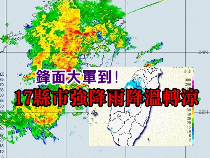 天氣風險公司總經理彭啟明也轉貼最新雷達回波圖,指「貓狗大軍又再來!」能清楚看見鋒面對流雲系正移入台灣上空。