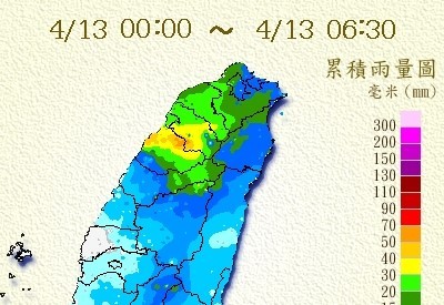 根據氣象局13日上午6時25分的資料,新竹縣和苗栗縣13日凌晨0時至今,降雨量分別為67.5和65.5毫米;最近1小時,新竹和苗栗降雨量各高達42和41毫米;另外,桃園縣、台中市和南投縣也都有超過30毫米降雨量。