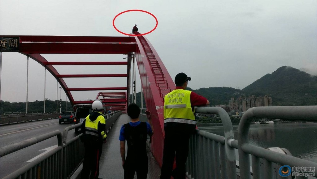 警方調查,簡姓男子(46歲)今日中午12時27分爬上關渡橋拱形鐵頂,民眾見狀急忙向警110、消119報案,警、消前後趕到現場聯手勸說簡男,才知他經商失敗後,揹負大筆債務且妻子長期洗腎,無法工作,家中還有三名幼子要扶養,經濟壓力很大。