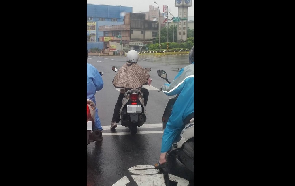 照片中的機車騎士將「廢棄雨傘」再利用,把傘柄、傘架拆除,還在傘帽中央開了一個洞讓頭穿過,就這麼當成了「雨衣」套在身上,抵禦綿綿細雨。