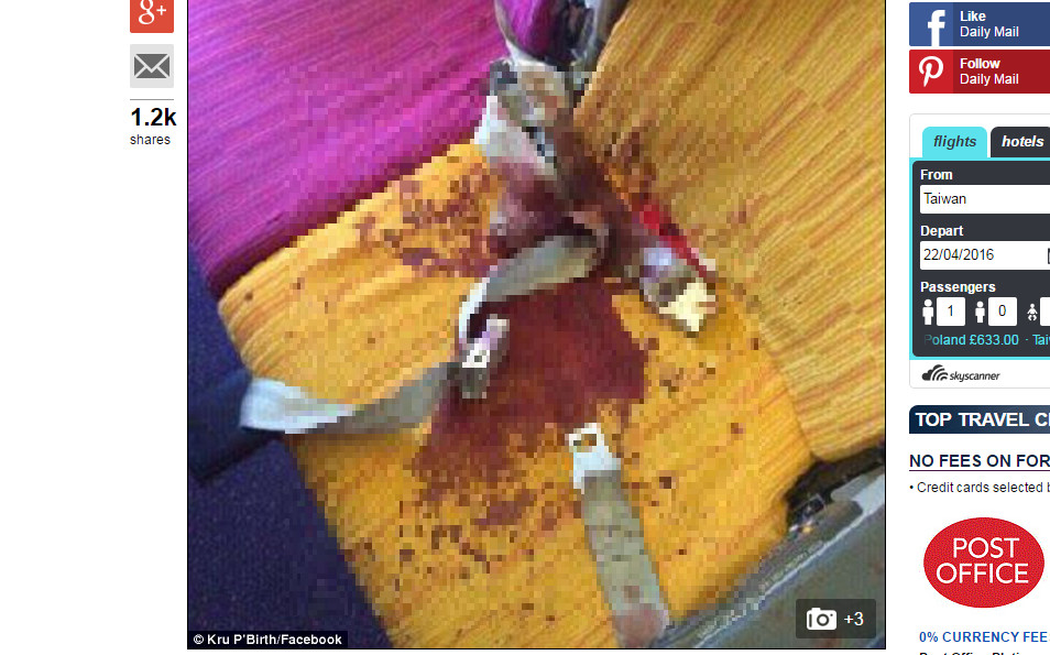 ▲受傷乘客當時座位上滿是血跡。(圖/翻攝自英國《每日郵報》)