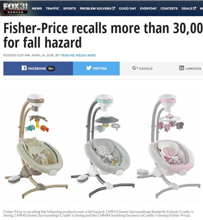 美國知名嬰兒品牌費雪(Fisher-Price),近日的產品報告顯示,支撐椅子的某個栓子可能會無預警脫落,將造成嬰兒安全疑慮,因而召回3種款式共計34000台電動安撫躺椅。目前尚未有嬰兒因此受傷。