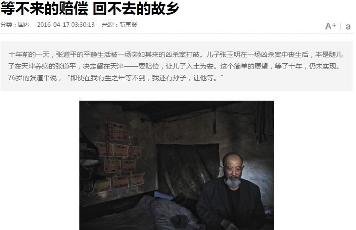 張道平2008年4月曾與其他親戚一起前往殯儀館,想將兒子「接回家」,但對方告知需繳納1.1萬人民幣(約5.4萬台幣)才能幫忙挖出並火化,於是他決定留在天津等凶手付完23萬元(約114萬台幣)賠償,平時就與孫子們擠在老舊的小房子裡度日,靠著變賣村民給的報廢物維持生計。