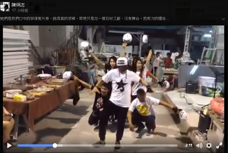 在東海大學任教的陳炯志日前於臉書分享一段影片,內容是一群菲律賓移工在工廠內大跳精采街舞,令人目不轉睛,也看到了不同於一般人對「外勞」的想像面貌。有網友留言說,很多菲律賓勞工喜歡跳舞,但願意讓他們這樣辦活動的雇主並不多。
