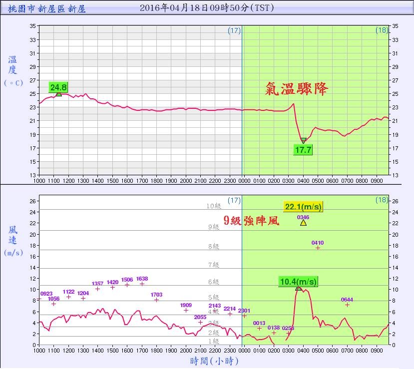 鄭明典談到,清晨一陣狂風掃過北台灣西部沿海區域,以新屋氣象站為例,當時氣溫除了驟降5度,風速也陡增近6級,陣風更高達9級。他指出,當時一道強烈的線狀對流系統還在海峽中線上,台灣北部沿海有另一道相對微弱的線狀回波,也因此它是一道「陣風鋒面」通過的現象。