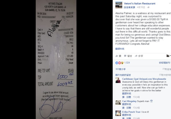 ▲美國一名女高中生在餐廳打工,一名男客得知她要打工賺學費的故事後,僅花10美元消費的他,事後結帳指定要給女高中生1000美元小費。(圖/翻攝自臉書)
