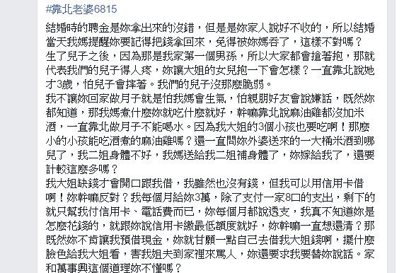 這名原PO還說,讓新生兒給姊姊的3歲兒抱,還被太太靠北;太太坐月子時把太太娘家送的米酒拿去給大姑喝,太太問米酒是「計較」,最令人傻眼的是,孩子剛滿6個月大,婆家就要求妻子出去工作,但妻子都以下班回家時間太晚不煮飯,「難不成要我媽還是我大姊煮給妳吃嗎?」