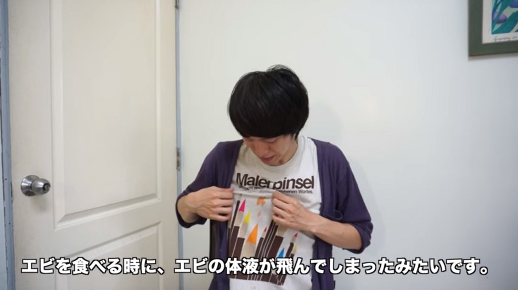 ▼志甫一成吃蝦時,蝦汁不小心噴到衣服。