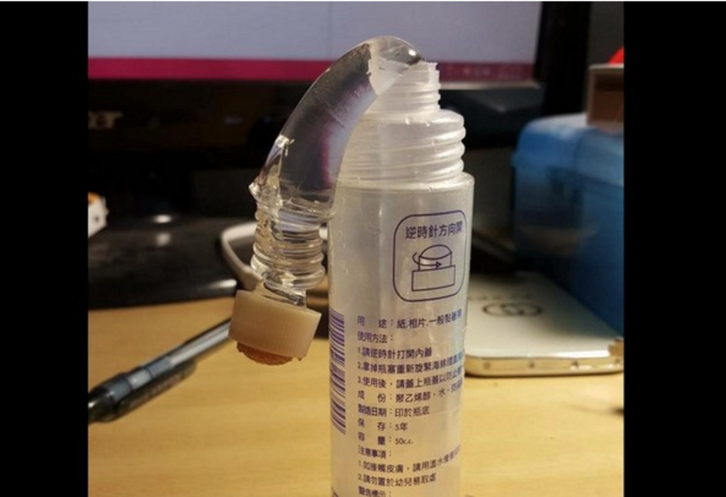 楊姓網友在「爆廢公社」PO文說「我只是想用個膠水而已,有必要這樣對我嗎?這膠水還真壞……直接露出。」此文不到14小時,已有1萬多人按讚。
