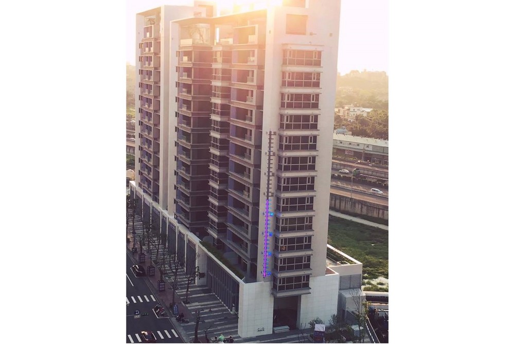 網友在貼文表示,「中壢環西路二段有溫度計的大樓」。只見這棟新式住宅風格簡約、高雅,人行道的條紋設計也超美,不過最特別的是,一旁閃著紫光的溫度計造型,感覺實用又賞心悅目阿!