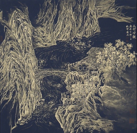 此次展覽最特殊的就是近10年前研發的「金山水」系列,靈感源自於從小在住家旁的廟宇,看著老師傅用金泥繪製「擂金畫」的印象,有別於傳統廟宇的繪製技法,運用金色的彩墨重新詮釋山水畫中常見的「皴法」技巧,細膩及富有層次感的筆韻,傳達書藝創作另一種新視覺體驗與高雅氛圍。詳情請上板橋435藝文特區網站「https://www.435.culture.ntpc.gov.tw/ 」查詢。