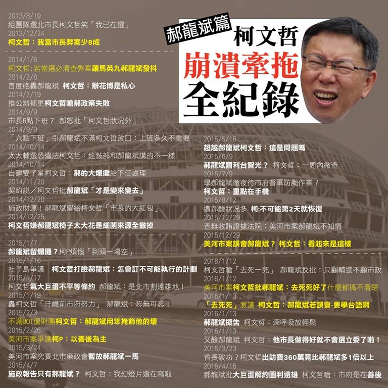台北市長柯文哲日前因為大巨蛋案,痛批總統馬英九撐腰遠雄,被網友酸「愛牽拖」,還把柯歷年來罵馬的言論全部列出;20日又再度整理崩潰牽拖全紀錄的「郝龍斌」篇,將前後兩任台北市長的攻防言論一一整理,許多網友在下面留言「這就叫罄竹難書了!」、「柯當市長弊案少八成,都發包不出去當然少八成」。