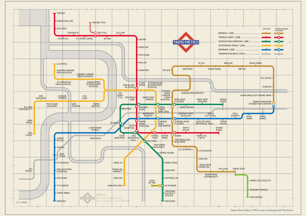 光是簡單的捷運路線圖,就有超深厚學問!網友David將台北捷運系統圖以英國倫敦地下鐵圖風格繪製,讓網友驚豔!David表示,創作發想是覺得有趣,而這幅模仿1959年英國工程繪圖師哈利貝克風格的北捷路線圖,也是想向地鐵拓樸圖先驅哈利貝克致敬!