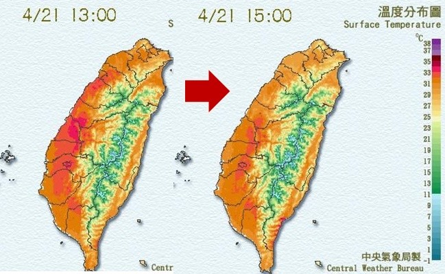根據中央氣象局觀測資料顯示,今天全台最高溫出現在台東大武34.9度,嘉義也出現33.8度高溫、台中33.2度,就連台北也出現33.1度,打破今年台北地區高溫紀錄。鄭明典今天上午也說,這不只是南風的溫暖,上方副熱帶高氣壓增強,使今日天氣穩定,雲量低,所以增溫快,「今天全台灣氣溫都會偏高,但是距離夏季的極端高溫還有一段距離,要先想想夏季要怎麼過了~」