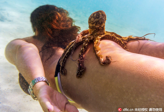 這些章魚們的吸盤和觸角直接貼在女孩的大腿、屁股和肚子上,而這群女孩們也似乎很享受,笑得十分開懷。潔西卡更說,「我很喜歡這些新朋友,和牠們游泳好開心,而且牠們好聰明!」潔西卡還戲稱想把牠們當成寵物養。