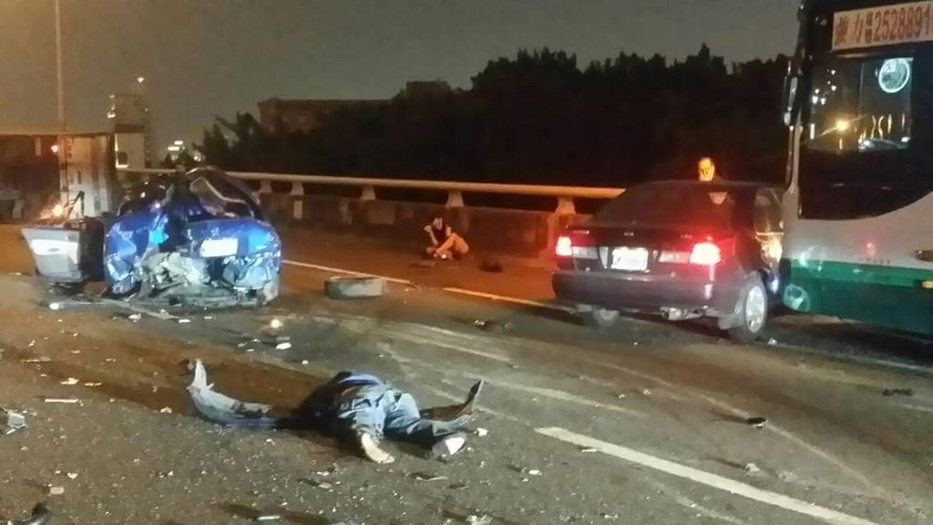 國道一號發生重大車禍!南下高架路段23.5公里鄰近圓山處,晚間8時20分發生車禍意外,一輛藍色自小客車被撞得幾乎全毀,駕駛疑似被出車外,直接趴在車道上,另外還有一輛黑色轎車和一輛公車,現場一片凌亂。有網友po出車禍現場照片,提醒用路人在經過此路段時要小心注意,建議改道,網友也替這名駕駛祈福,希望他平安無事。目前得知一共有3名傷者,全都送往林口長庚醫院急救。