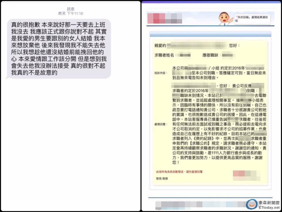 廖先生在臉書「爆廢公社」PO文表示,他透過人力銀行面試了一位小姐,沒想到她第一天報到就爽約,當下立即向人力銀行反映,這位小姐在事後也傳訊息給廖先生道歉,表示「其實我愛的男生要跟別的女人結婚,我很來想放棄,但我發現我不能失去他,所以才去挽回他的心,本來愛情跟工作該分開,但我真的沒辦法接受會失去他,真的很對不起,我不是故意的。」