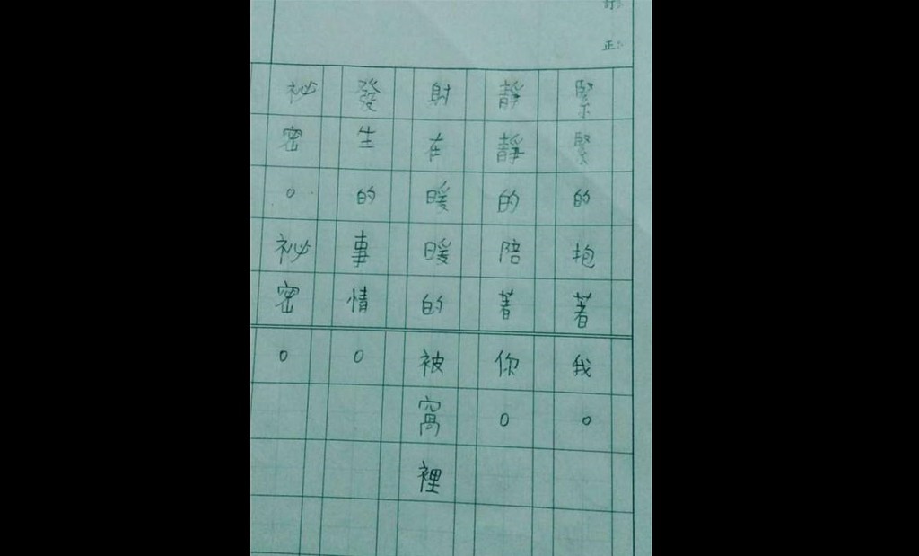 外甥在作業簿上寫著「緊緊的抱著我。靜靜的陪著你。射在暖暖的被窩裡。發生的事情。秘密。秘密。」引人無限遐想。