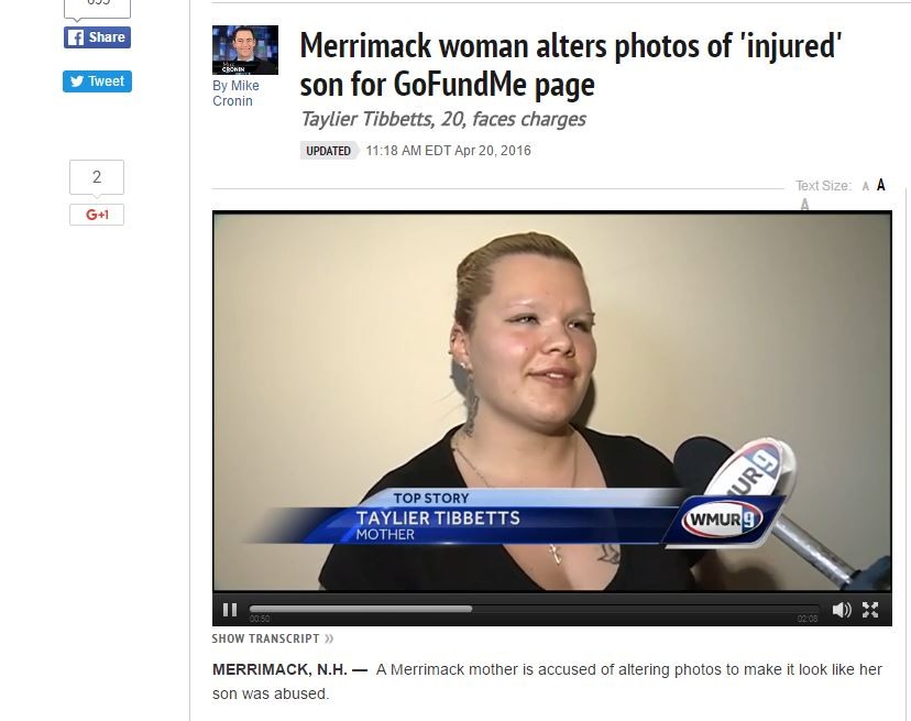 美國新罕布夏州20歲女子蒂貝茨(Taylier Tibbetts),去年11月報警稱3歲的兒子遭虐待,並且在GoFundMe網站刊登兒子肋骨處瘀青照片發起募款活動。警方經調查發現,小男孩的照片經過後製加工處理,目前該名母親已被當地警方逮捕。